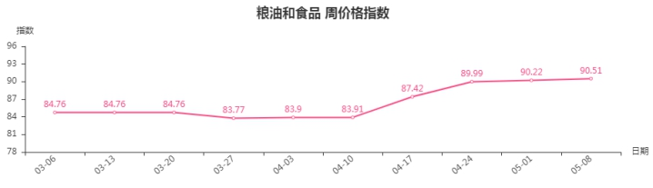 本周,粮油和食品类周价格指数收于99.51点,环比上涨0.29点。其中,二级指数分类中方便食品类、粮油类、糖果制品类、干果类指数分别上涨0.43、0.37、0.02、0.01点。