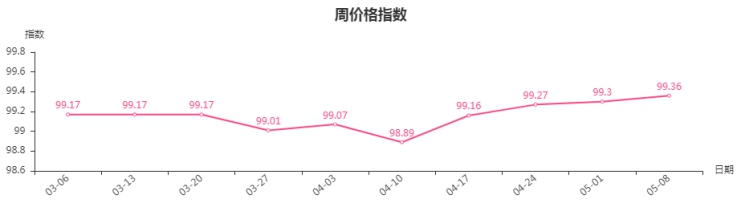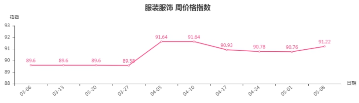 受五一假期消费拉动,服装服饰类市场客流量增多,市场春季服装促销力度大,夏季服装热销;内衣、童装等夏季服装价格回升。从具体规格品来看,女士车牌上衣8899本周均价78.00元/件,较上周上涨13.90%;戴梦思2098纯棉女士内衣套装本周均价110.00元/套,较上周上涨13.80%;万芙童女童短袖T恤本周均价53.57元/件,较上周上涨7.10%。