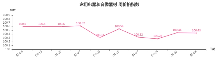 本周,家用电器和音像器材类周价格指数收于100.43点,环比下跌0.01点。其中,厨房电器类、个人生活电器类、家居电器类、热水器类、音像器材类指数分别下跌0.19、0.18、0.06、0.04、0.01点,制冷电器类、净化电器类指数分别上涨0.64、0.45点。