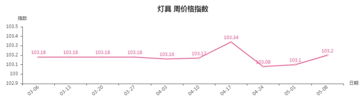 本周,灯具类周价格指数收于103.20点,环比上涨0.10点。其中,商业照明类、户外照明类指数分别上涨0.37、0.23点,灯具配件类、家居照明类指数分别下跌0.09、0.06点。