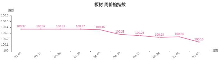 本周,板材类周价格指数收于100.15点,环比下跌0.09点。其中,贴面板类、密度板类、多层板类、石膏板类、木工板类指数分别下跌1.06、0.06、0.06、0.04、0.02点。