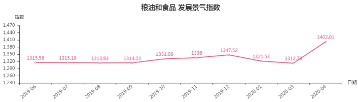 4月份,粮油和食品类发展景气指数收于1402.01点,环比上涨89.23点,涨幅6.80%;同比上涨86.48点,涨幅6.57%(见下图)。