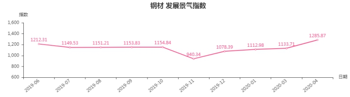 4月份,钢材类发展景气指数收于1285.87点,环比上涨152.16点,涨幅13.42%,同比上涨111.97点,涨幅9.54%(见下图)。
