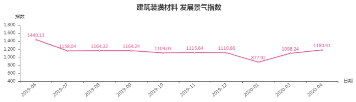 4月份,建筑装潢材料类发展景气指数收于1180.91点,环比上涨82.67点,涨幅7.53%;同比上涨52.70点,涨幅4.67%。