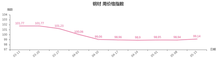 本周,钢材类周价格指数收于99.14点,环比上涨0.20点,涨幅0.20%。从盘面看,钢材三级分类指数涨多跌少,其中型材类、板材类、建筑钢材类小幅上涨,指数分别上涨0.38、0.15和0.15点,管材类指数不涨反跌,环比下降0.13点。