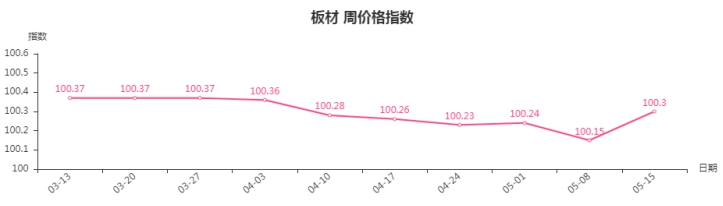 本周,板材类周价格指数收100.30点,环比上涨0.15点。其中,材料板材中木工板类、贴面板类、多层板类、石膏板类指数分别上涨1.33、0.17、0.10和0.03点,密度板类指数下跌0.01点。