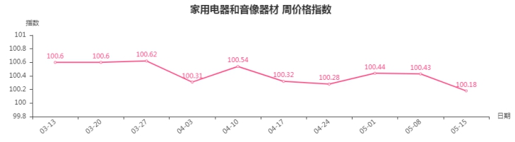 本周,家用电器和音像器材类周价格指数收于100.18点,环比下跌0.25点。其中,家居电器类、热水器类、厨房电器类、电风扇类、制冷电器类指数分别下跌1.16、0.25、0.18、0.17、0.12点,净化电器类、个人生活电器类指数分别上涨0.04、0.02点。