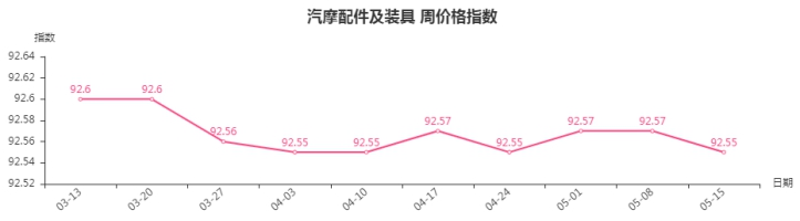 本周,汽摩配件及装具类周价格指数收于92.55点,环比下跌0.02点。二级子类中汽车装饰类指数下跌0.10点,汽车配件类、摩托车配件类指数与上周持平。