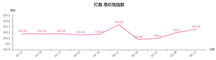 本周,灯具类周价格指数收于103.26点,环比上涨0.06点。其中,商业照明类、灯具配件类、家居照明类指数分别上涨0.19、0.11、0.03点,户外照明类指数下跌0.04点。
