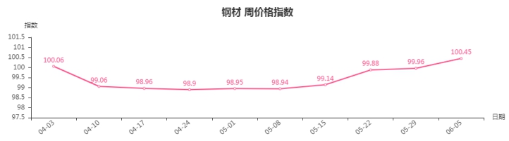 本周钢材类周价格指数继续上行,受生产成本上涨以及钢材期货上行拉动,市场钢材价格小幅上涨,市场销售情况良好,需求增大,销售量增多。从市场具体规格品看,板材中2.75mm薄钢板价格3855.00元/吨,上涨4.20%,10mm中厚钢板价格3450.00元/吨,上涨4.50%,型材中50*50mm角钢价格3400.00元/吨,上涨3.00%,宽20cm工字钢价格3420.00元/吨,上涨1.40%,管材中镀锌50圆管价格5992.00元/吨,上涨1.60%。