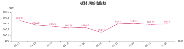本周,板材类周价格指数收于100.30点,环比上涨0.01点。从盘面看,石膏板、密度板、木工板、铝塑板类指数分别上涨0.03、0.02、0.01和0.01点,贴面板类指数下跌0.05点。
