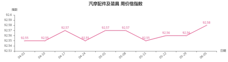 本周,汽摩配件及装具类周价格指数收于92.58点,环比上涨0.02点。其中,汽车装饰类上涨0.09点,汽车配件类、摩托车配件类指数均与上周持平。