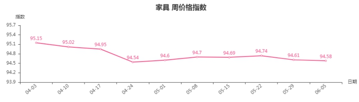 本周,家具类周价格指数收于94.58点,环比下跌0.03点。从盘面看,床及用品类、坐具类、桌类指数分别下跌0.13、0.07、0.02点,是拉动家具类周价格指数下跌的主要因素。