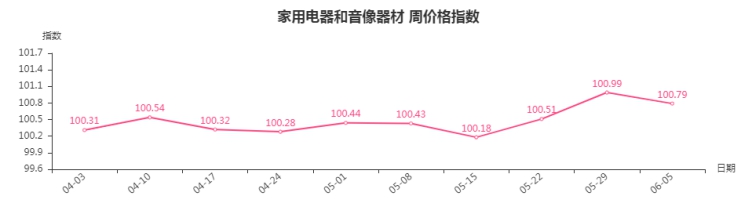 本周,家用电器和音像器材类周价格指数收于100.79点,环比下跌0.20点。其中,制冷电器类、电风扇类、热水器类、厨房电器类、净化电器类指数分别下跌1.03、0.32、0.32、0.27、0.02点,音像器材类、家居电器类、个人生活电器类指数分别上涨0.11、0.10、0.02点。