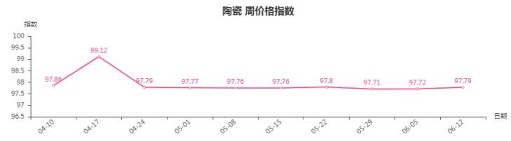 本周,陶瓷类周价格指数收于97.79点,环比上涨0.07点,涨幅0.07%。从二级分类看,日用陶瓷类周价格指数小幅上涨,涨幅0.44%;建筑陶瓷、陶瓷洁具类周价格指数环比波动较小,基本保持稳定。