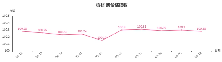 本周,板材类周价格指数收于100.28点,环比下跌0.02点。从盘面看,多层板、贴面板类指数分别下跌0.22点和0.03点,密度板、刨花板、铝塑板类指数均下跌0.01点;石膏板类指数上涨0.12点。