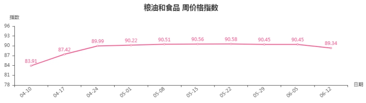本周,粮油和食品类周价格指数收于89.34点,环比下跌1.11点。其中,粮油类、茶叶类、蔬菜制品类、干果类指数分别下跌1.42、0.15、0.03、0.01点,粮油和食品类其它二级分类指数保持平稳。