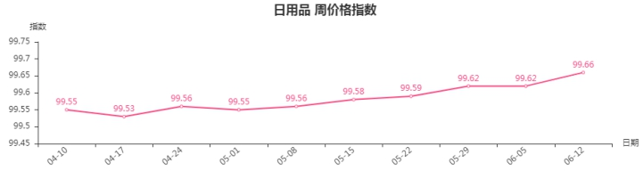 本周,日用品类周价格指数收于99.66点,环比上涨0.04点。从盘面看,卫生清洁日用品类、玩具类、厨房用品类指数分别上涨0.11、0.08和0.05点,其它二级分类指数保持平稳。