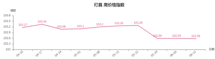 本周,灯具类周价格指数报收于102.58点,环比下跌0.01点。二级子类中,商业照明类、家居照明类指数分别下跌0.07、0.01点,户外照明类、灯具照明类指数分别上涨0.05、0.01点。