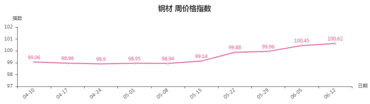 本周,钢材类周价格指数收于100.62点,环比上涨0.17点,涨幅0.17%,从盘面看,钢材指数三级分类全部出现上涨,其中建筑钢材涨幅最大,上涨0.30点,成拉动指数上涨主力,管材类、板材类、型材类指数分别上涨0.16、0.16和0.11点。