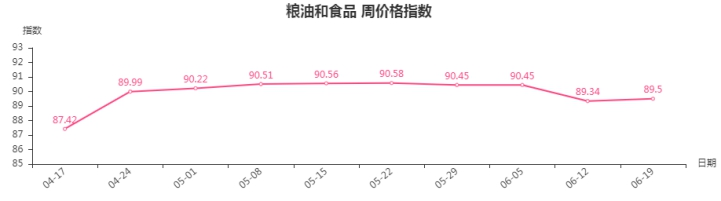 本周,粮油和食品类周价格指数收于89.50点,环比上涨0.16点。指数二级分类中,粮油类指数上涨0.21点,拉动粮油和食品类指数上涨;茶叶类、干果类指数分别下跌0.21点和0.02点。