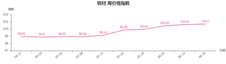 本周,钢材类周价格指数收于100.70点,环比上涨0.08点,涨幅0.08%。钢材指数三级分类全部出现上涨,其中型材类涨幅较大,指数环比上涨0.11点,板材类、建筑钢材类、管材类微幅上涨,指数分别上涨0.06、0.05和0.03点。