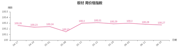 本周,板材类周价格指数报收于100.27点,环比下跌0.01点。二级子类中,贴面板类、木工板类、密度板类、石膏板类指数分别下跌0.06、0.02、0.01和0.01点。