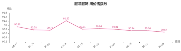 近期,夏装上市热销,市场销量较为稳定,商品价格浮动较小,但受炎热和多雨天气影响,运动服装类商品需求不断减少;同时,夏季是婚嫁事宜淡季,新娘礼服需求减少,商品价格下跌,拉动整体价格下行。从具体规格品来看,韩迪娅2828女士纯棉短袖本周均价57.50元/件,较上周下跌7.30%;新娘套装礼服810本周均价260.00元/套,较上周下跌6.60%;越也女童短袖T恤12184纯棉本周均价140.00元/件,较上周下跌5.40%。