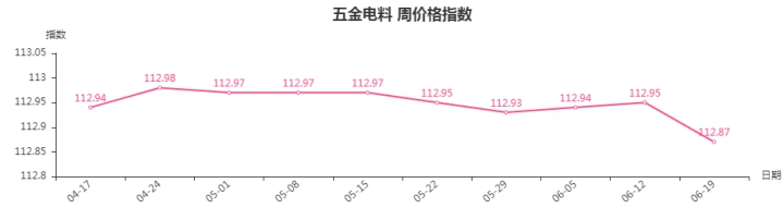 本周,五金电料类周价格指数收于112.87点,环比下跌0.08点。其中,五金工具类、电工电器类、建筑装饰五金类周价格指数分别下跌0.11、0.04、0.01点,仪器仪表类指数上涨0.03点。
