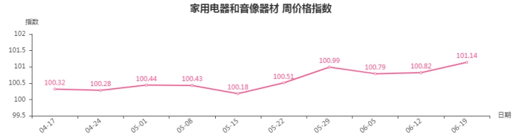 本周,家用电器和音像器材类周价格指数收于101.14点,环比上涨0.32点。其中,厨房电器类、制冷电器类、音像器材类、电风扇类指数分别上涨1.22、0.09、0.07、0.05点,净化电器类、热水器类、个人生活电器类指数分别下跌0.65、0.19、0.05点。