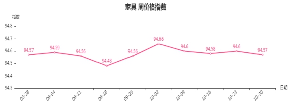 本周,家具类周价格指数收于94.57点,环比下跌0.03点。从盘面看,坐具类、柜类、架类分别下跌0.06点、0.05点、0.03点,其中三级分类文件橱类、鞋柜类、衣帽架分别下跌0.46点、0.42点、0.14点,是拉动家具类周价格指数下跌的主要因素。