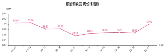本周,粮油和食品类周价格指数收于89.01点,环比上涨0.34点。其中二级子类中粮油类、干果类、茶叶类指数分别上涨0.43、0.34、0.21点,拉动粮油和食品类指数上涨。
