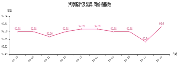本周,汽摩配件及装具类周价格指数收于92.6点,环比上涨0.06点。其二级子类中汽车装饰类指数回升,上涨0.26点,具体来看,汽车小饰品、汽车玻璃贴膜、车用电子产品、汽车改装配件、汽车座垫分别上涨1.11、0.41、0.37、0.19、0.14点。