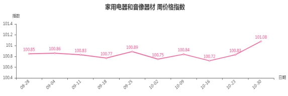 本周,家用电器和音像器材类周价格指数收于101.08点,环比上涨0.25点。其二级子类中厨房电器类、个人生活电器类、音像器材类指数分别上涨0.99、0.08、0.01点,热水器类、净化电器类、制冷电器类指数分别下跌0.62、0.13、0.07点。