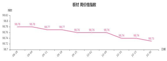 本周,板材类周价格指数收于98.73点,环比下跌0.01点。其中石膏板类周价格指数下跌0.08点,铝塑板类周价格指数上涨0.04点。