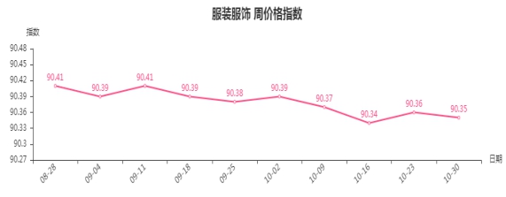 本周,服装服饰类周价格指数收于90.35点,环比下跌0.01点。从盘面看,服装类下跌0.02点,其中三级分类特殊服装、内衣、男童装类指数分别下跌0.04点、0.03点、0.02点,是拉动服装服饰类周价格指数下跌的主要因素。