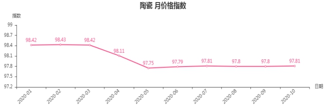 10月份,陶瓷类价格指数收于97.81点,环比上涨0.01点,涨幅0.01%;同比下跌0.65点,跌幅0.61%。
