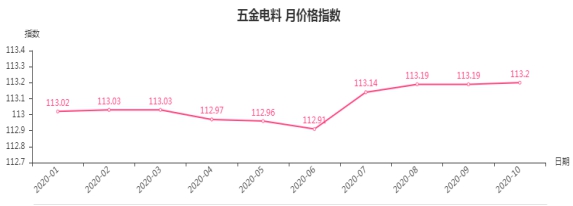 从监测数据来看,10月份五金电料类价格走势呈V型,在中旬略有下降, 月初周价格数据收于113.2点,16日、23日公布的周价格数据均收于113.19点,月末再次涨到113.2点。细看各子类中,五金工具类、建筑装饰五金类、电工电器类今年10月价格指数与去年同期基本一致,均表现为稳中见好。