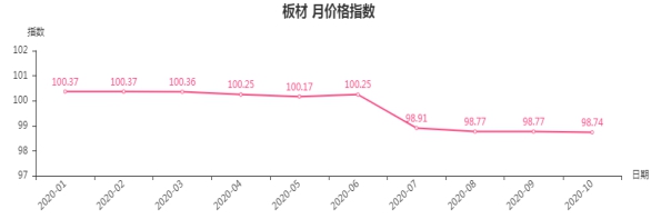 本月板材类月价格指数收于98.74点,较上月下跌0.03点;同比去年10月下跌1.63点,跌幅1.62%。