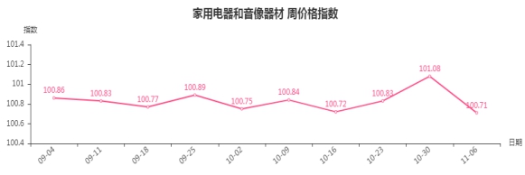 本周,家用电器和音像器材类周价格指数收于100.71点,环比下跌0.37点。其二级子类中厨房电器类、净化电器类、音像器材类指数分别下跌1.44、0.16、0.03点,制冷电器类、热水器类指数分别上涨0.04、0.2点。