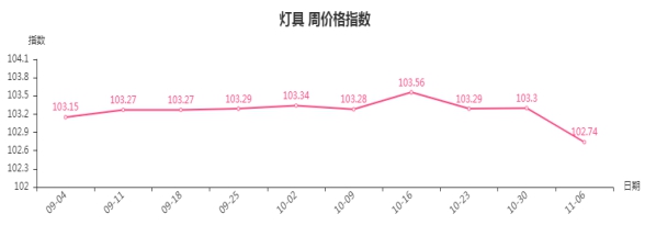 本周,灯具类周价格指数收于102.74点,环比下跌0.56点。其二级子类中家居照明类、工艺灯及灯饰类、户外照明类指数分别下跌1.43、0.81、0.05点,其中家居照明中台灯、壁灯、吸顶灯分别下跌11.74、0.38、0.04点,工艺灯及灯饰中的灯笼下跌0.81点,户外照明中的投光灯、道路灯分别下跌0.12、0.07点。