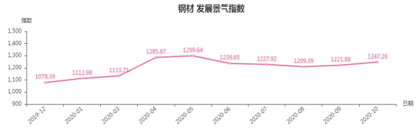 10月份,钢材类发展景气指数收于1247.26点,环比上涨25.38点,涨幅2.08%;同比上涨92.42点,涨幅8%。