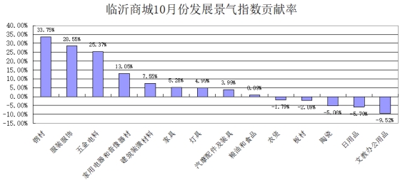 从对发展景气总指数贡献率看,钢材类、服装服饰类、五金电料类等3大类商品对总发展景气指数上涨拉动较大,贡献率分别为33.75%、28.55%、25.37%(根据各大类商品指数下跌和所占权重测算)。