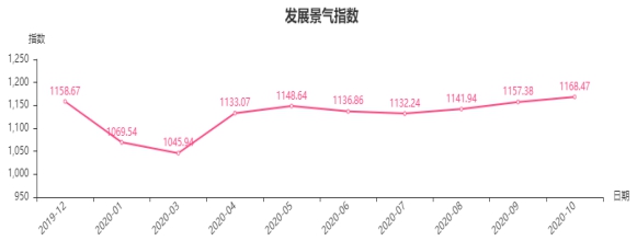 从发展景气指数构成来看,2020年10月份,发展规模指数收于1131.16点,环比上涨10.63点,涨幅0.95%,调查问卷显示,认为本月本类商品的进货量上升的商户环比上涨1.8%;发展效益指数收于1341.69点,环比上涨19.35点,涨幅1.46%,调查问卷显示,认为本月本类商品销售实现的经营毛利总额增加的商户环比上涨0.4%;发展信心指数收于1001.93点,环比下跌0.12点,跌幅0.01%,调查问卷显示,认为本月本类商品总体经营状况较好的商户环比下跌1.4%。