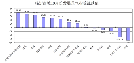 从14类商品发展景气指数看,环比9涨5跌。其中,涨幅前3位的是:家用电器和音像器材类、灯具类、家具类,分别上涨39.63、36.58、33.35点;跌幅前3位的是:农资类、文教办公用品类、陶瓷类,分别下跌34、25.15、9.31点(见下图)。