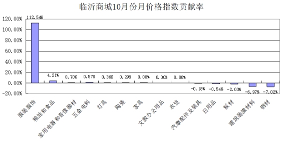 从对价格总指数贡献率看,临沂商城价格指数主要由服装服饰类拉动上涨,贡献率达到112.54%,其次是粮油和食品类,贡献率为4.21%(见下图)。