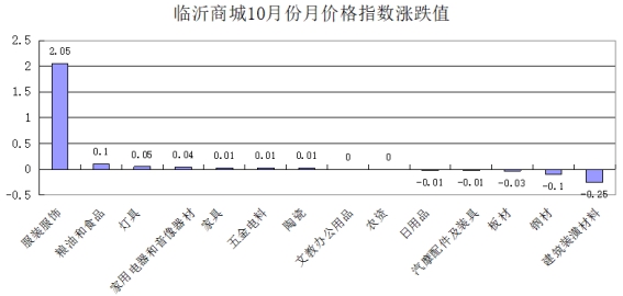 从14类商品价格指数看,环比7升2平5降。其中,涨幅前3位的是:服装服饰类、粮油和食品类、灯具类,分别上涨2.05、0.1、0.05点;跌幅前3位的是:建筑装潢材料类、钢材类、板材类,分别下跌0.25、0.1、0.03点(见下图)。