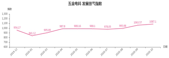 10月份五金电料类发展景气指数收于1087.1点,环比上涨23.53点,涨幅2.21%,同比上涨138.51点,涨幅14.6%(见下图)。