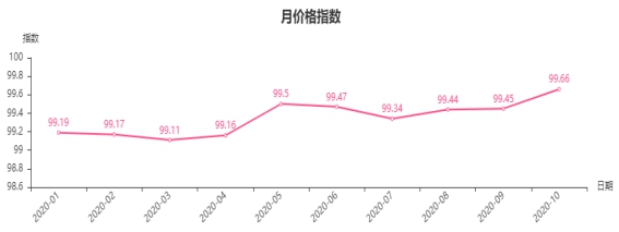 从月价格指数曲线走势来看,10月份,临沂商城价格指数环比继续上涨,涨幅明显扩大(见下图)。
