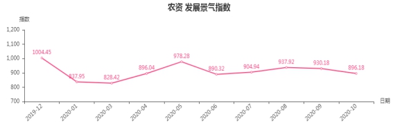 10月份,农资类发展景气指数收于896.18点,环比下跌34点,同比下跌123.7点;月价格指数收于92.14点,较上月持平。